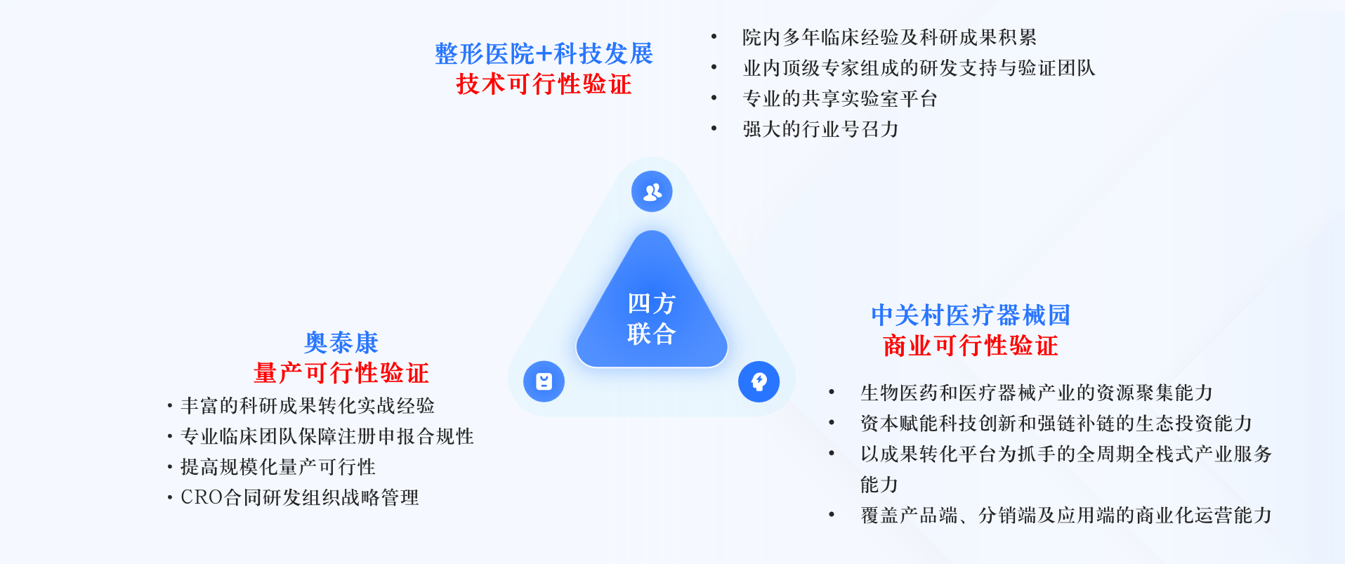 北京市整形醫(yī)學(xué)概念驗證中心項目,由四家單位聯(lián)合申報實施。其中北京八大處整形科技發(fā)展有限公司聯(lián)合中國醫(yī)科院整形外科醫(yī)院完成技術(shù)可行性驗證,北京奧泰康醫(yī)藥技術(shù)開發(fā)有限公司負(fù)責(zé)量產(chǎn)化驗證,中關(guān)村醫(yī)療器械園有限公司完成商業(yè)化驗證,四方相互協(xié)同,構(gòu)建“醫(yī)研產(chǎn)銷”一體化生態(tài)。